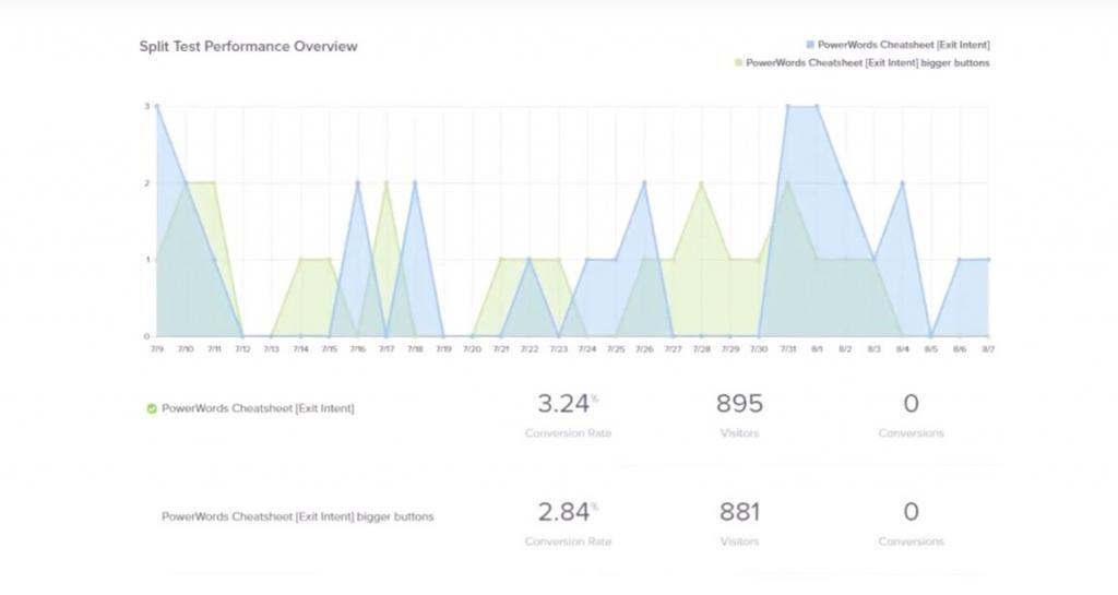 To do your A/B test, set up two pop-ups with different content and compare how they perform. You can then do more in-depth tests for that pop-up, like the specific CTA text or visuals you’re using. Optinmonster gives you a great split test performance overview: