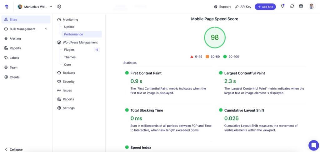 Step one is always knowing your numbers. Monitoring won’t speed up your sites directly – but you can’t fix what you don’t track. A WordPress management tool like WP Umbrella gives you a centralized dashboard to monitor all your sites in one place and track key metrics like: