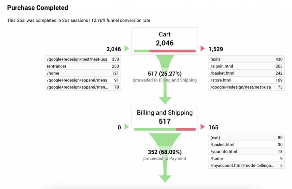 From the Goals reports in Google Analytics, we need to pay attention to Goal Funnels. Step by step, we can see how many people went from putting products into their carts into actually buying them. You can see where there are dropouts, so solutions for that exact step or steps can be found.