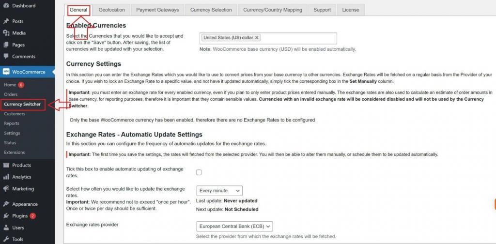- After activation, the plugin’s settings will appear under WooCommerce > Currency Switcher.