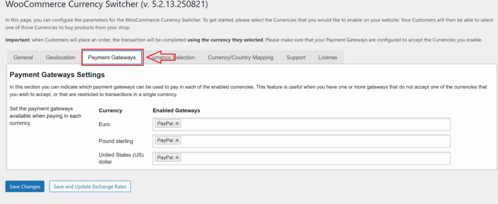 - Navigate to WooCommerce > Currency Switcher > Payment, then tick which gateways should be available per currency.