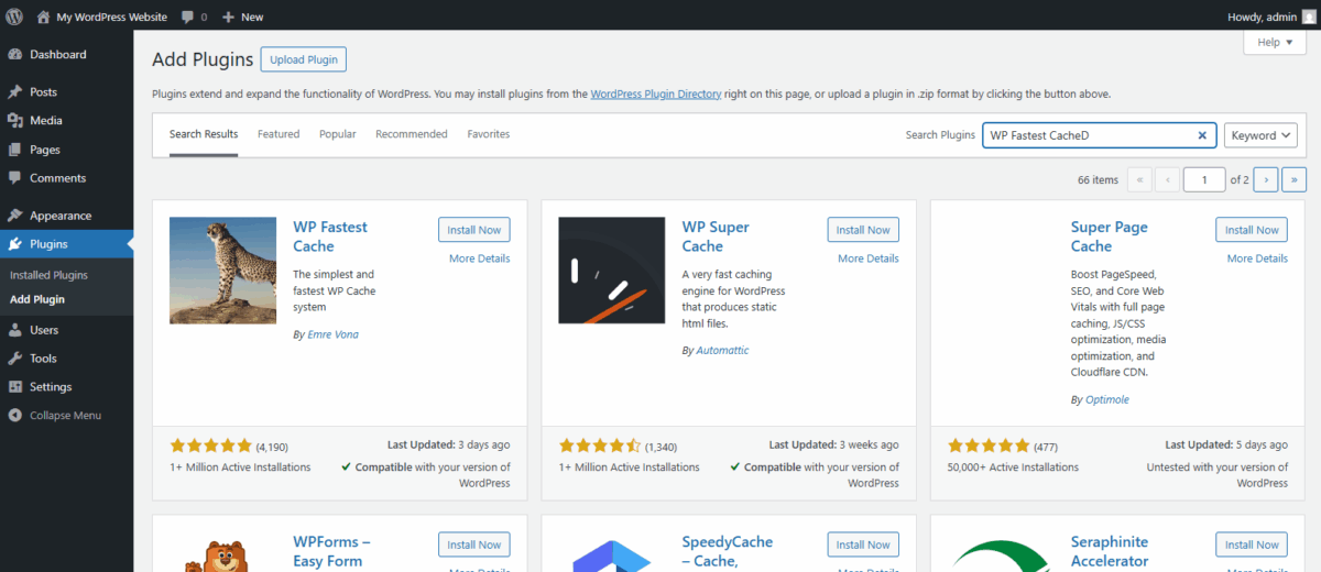 Go to Plugins → Add New and search for “WP Fastest Cache” to activate it in one click.