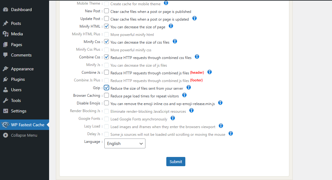 - Optimize Media: Just use the premium features in WP Fastest Cache to convert images to WebP, compress media files, and enable lazy loading