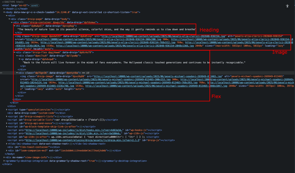 In comparison, when the same design is recreated in Droip, the code is clean and bloat-free, with only what is essential.