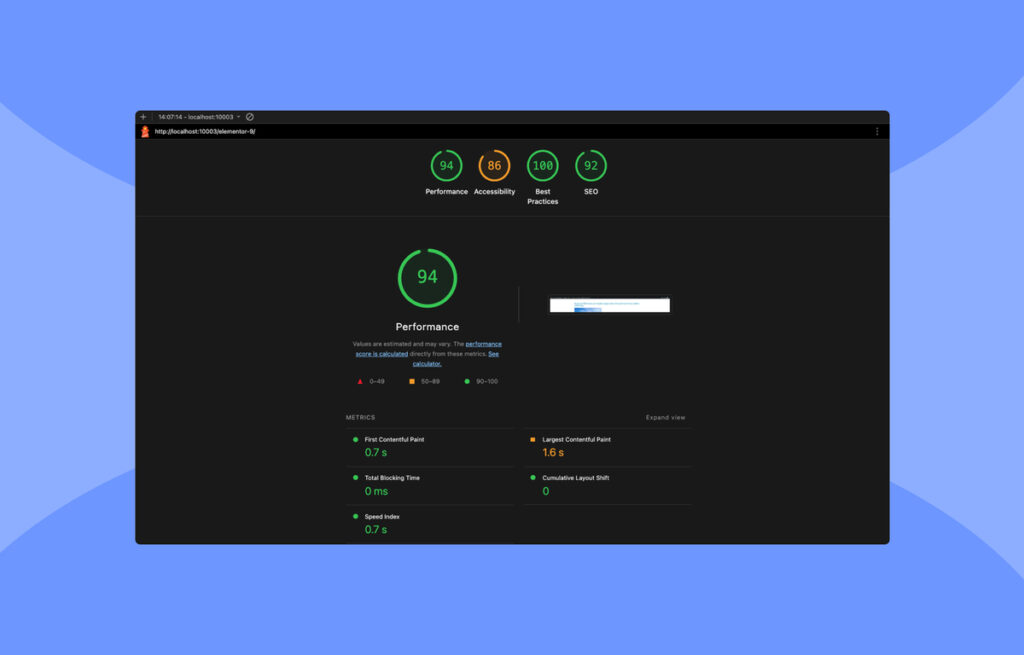 Next, it’s time to compare the performance. For accuracy, we ran tests using the Lighthouse tool under identical conditions — both sites were built with a WordPress clean setup and the default Twenty Twenty-Five theme.