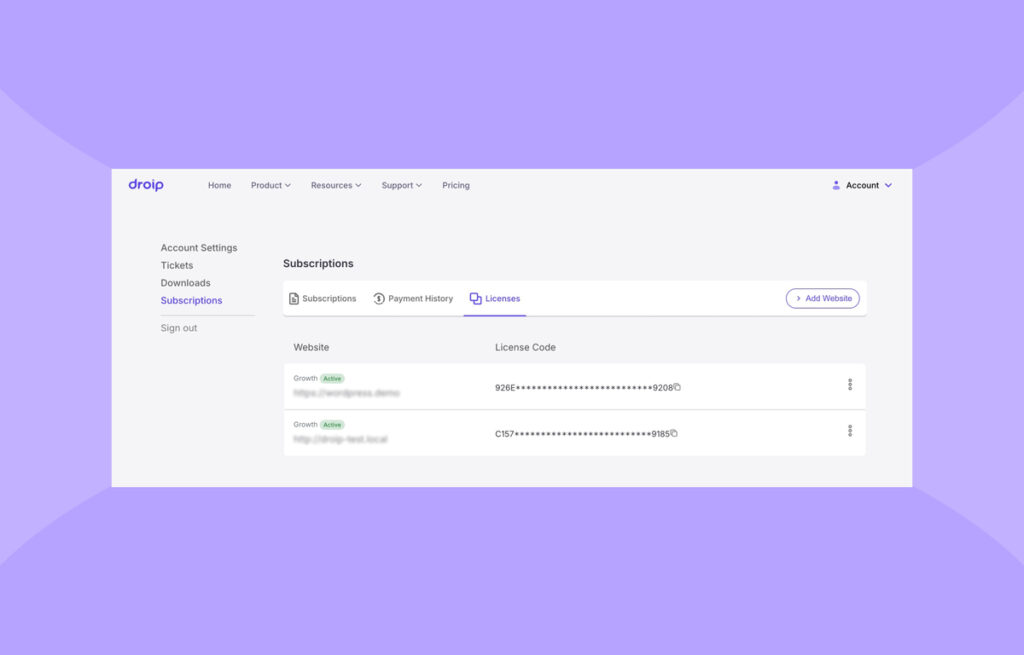 Finally, activate your license. Head back to the Droip website and go to Subscriptions > License to add your site and copy the license key.