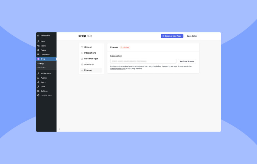 Then, go to WP Admin > Droip > License, paste it, and hit Activate License.