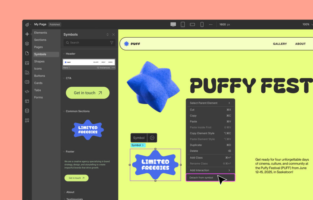 Speaking of pre-built components, Droip’s Symbols make it easy to save any design and reuse it anywhere in the site.
