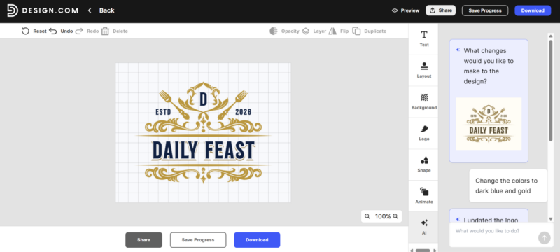 Just describe what you want changed, and the tool handles the rest instantly. For instance, you could ask it to change the colors. Here we asked it to change it to dark blue and gold: