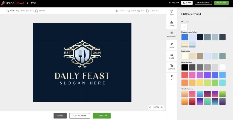 Refine the colors, fonts, layouts, and icons until every detail feels like yours. Here’s an example of a logo generated from BrandCrowd: