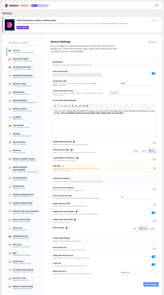 After installing and activating the Dokan multivendor plugin, the next step is to configure the basic settings. You can find all the settings options in WP Admin → Dokan → Settings.