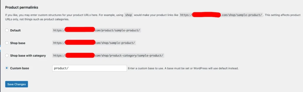 You also need to adjust your permalink settings to prevent 404 errors on some pages. Go to WP Admin → Settings → Permalinks → Product Permalinks, select the Custom Base option, and enter /product in the box. This will ensure your product pages have the correct URL structure.