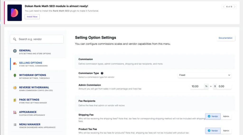 You’ll have different options to set the commission as a percentage or a fixed amount. Dokan supports various types of vendor commissions, giving you flexibility in how you charge sellers.