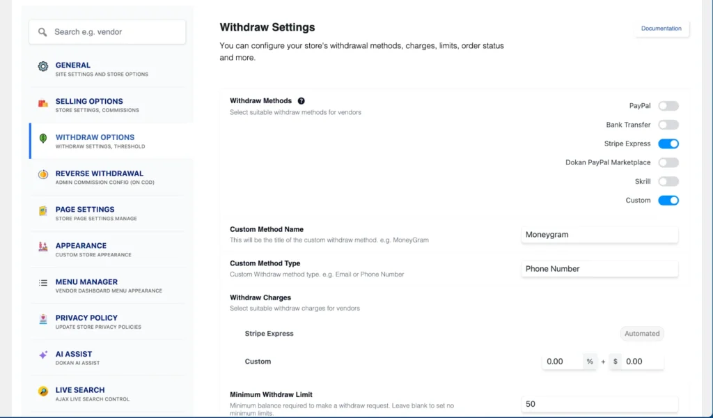 To set it up, go to WP Admin → Dokan → Settings → Withdraw Options. Here, you can choose the withdrawal method and set the minimum balance a vendor must have before requesting a payout. This ensures vendors can access their earnings smoothly and efficiently.