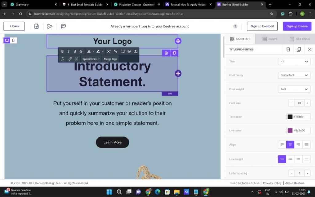 Your email should start with your appealing business logo and introductory lines. You can add and customize them by dragging and dropping structures and content blocks, as shown in the image below. You can change tile properties and get the general options for background color, text alignment, text color, image, link color, etc.