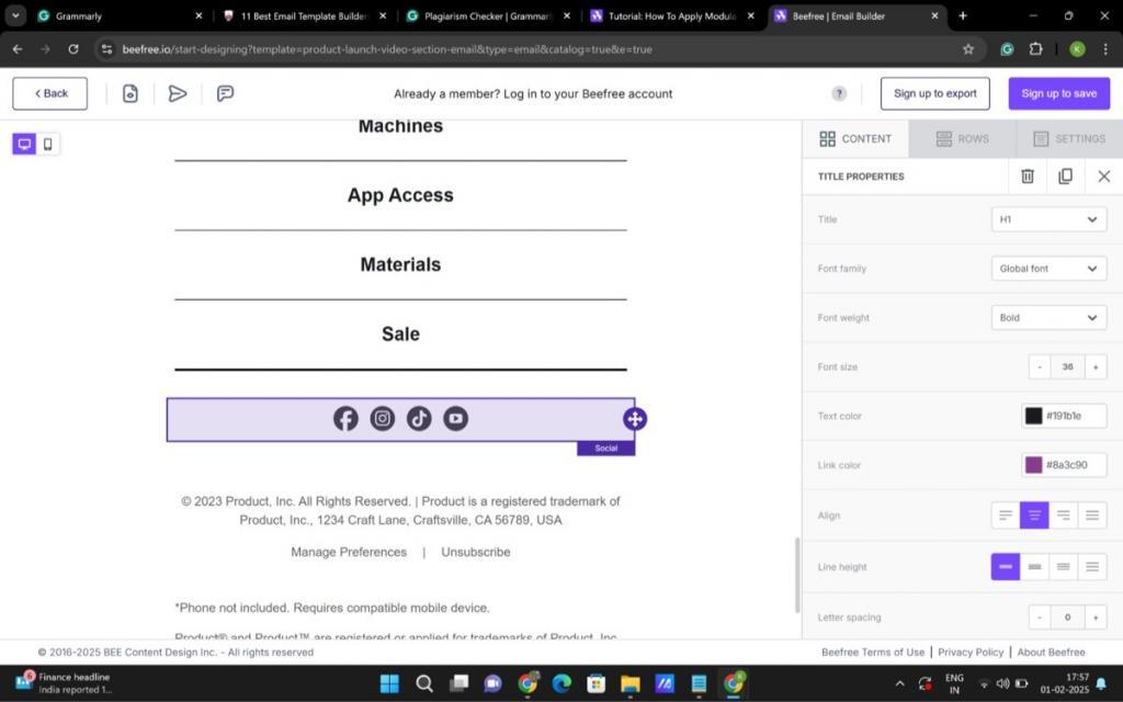 While adding stylish and creative elements, ensure you maintain professionalism in your email. You should add the copyright footer and product authenticity, wordmark, logos, and trademarks owned by the Product, Inc., and any use of such marks by the Product, Inc. is under license. You can also add social icons leading your product pages on your social media accounts.