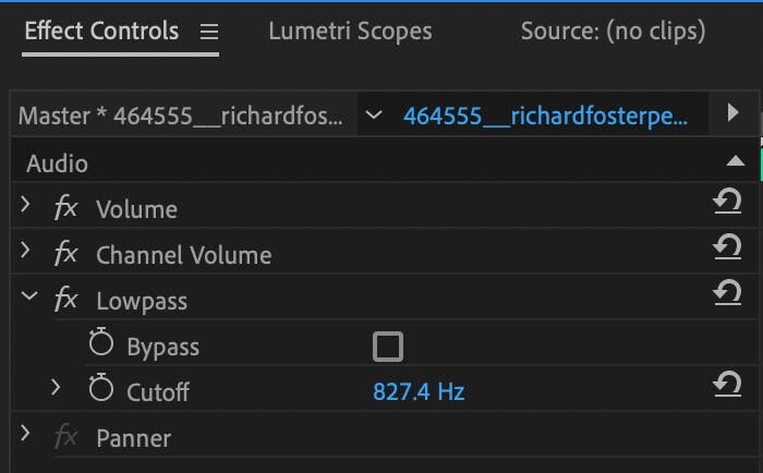 A small, purple ‘Fx’ symbol will appear on your audio clip, click on it to open the Effect Controls window. The lowpass effect is incredibly easy to use, simply drag the cutoff value up and down until you find the setting that gives you the sound you want. Alternatively, if you know a thing or two about the frequency spectrum, you can type in the value that you want to set the cutoff at.