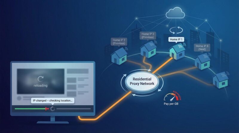 A residential proxy works the same way online. Your traffic exits through an IP tied to a real household, so Netflix sees what looks like an ordinary subscriber in suburban London or downtown Chicago.