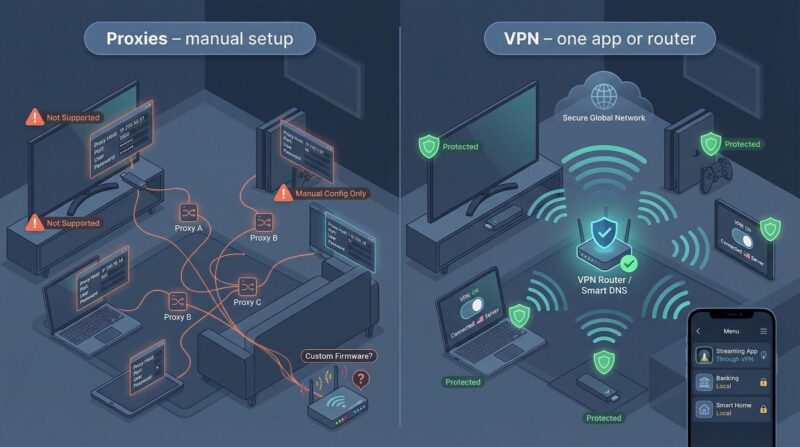 A single VPN subscription often supports five to ten devices at once, so roommates and travelers log in with a shared server list instead of hunting fresh proxy IPs. Tech support becomes “Tap this country flag if the first one fails,” not “Let’s reconfigure every port on your smart TV again.”