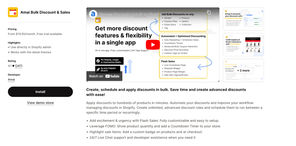 Amai Bulk Discount and Sales enables store owners to quickly create, schedule, and set up discounts on hundreds of products within seconds. Owners can set up unlimited advanced discount rules and also choose to plan them on certain dates or times in the future.