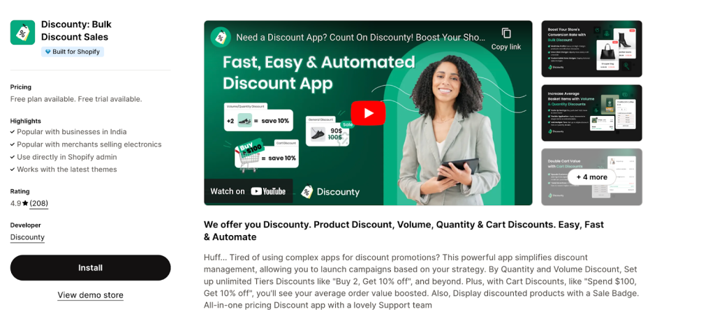 Discounty is another discount app on the Shopify app store that is focused on helping stores increase sales with customized discounts for customers that place orders in bulk. It helps in setting up special prices for buying more and thus helps store owners to encourage large order values in their store.