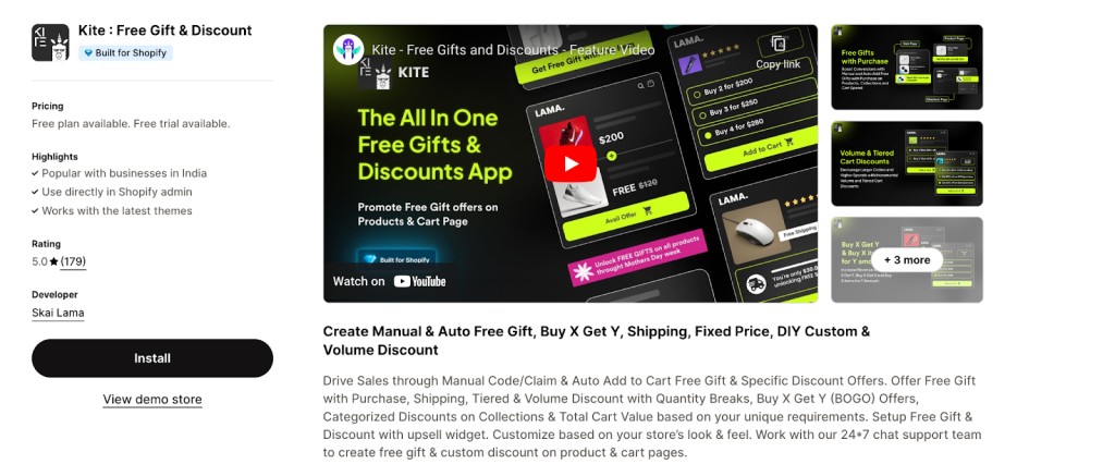 Kite helps Shopify store owners by allowing them to offer discounts and free gifts to their customers. The app is designed to increase user engagement with features like manual discounts and automatically adding free gifts to carts, which ultimately can result in more sales for the business.